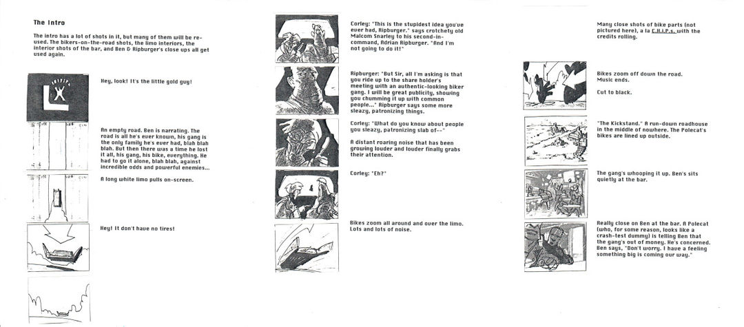 Tim: Let me see if there’s anything in my Full Throttle binder here. Yeah, I can see that I’m already defensive about the expense of it: “The intro has a lot of shots in it, but many of them will be reused.” [laughs] “The bikers on the road shots, the limo interiors, the interiors shots of the bar, and Ben and Ripburger’s close-ups all get used again.” These aren’t just wasted and thrown away, they can all come back! Things were so tight.